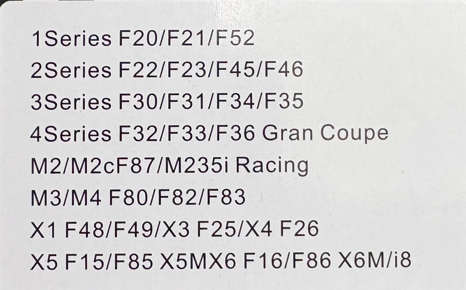 Fits F20, F22, F30, F32 and many more. List of vehicles that these fit on are in the second picture of the listing.